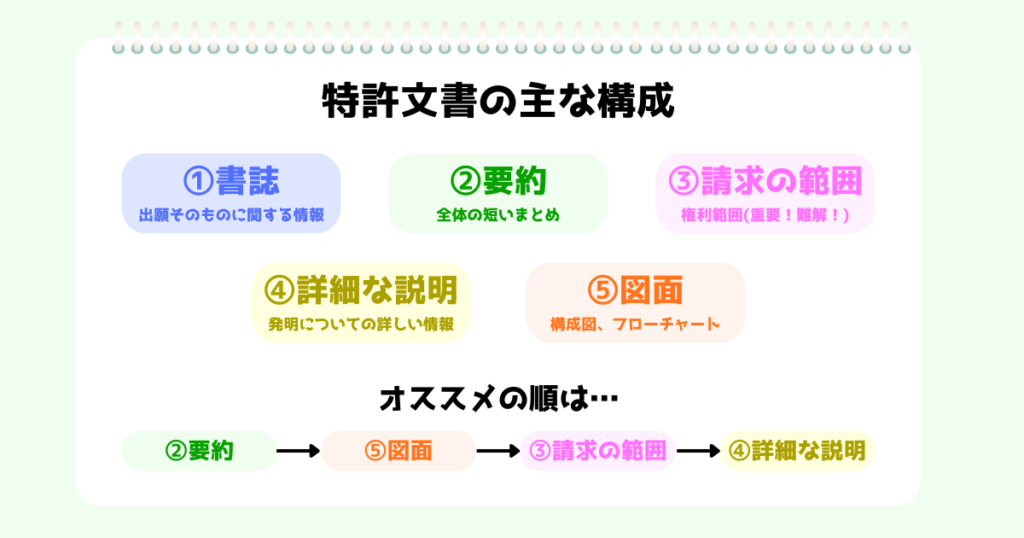 特許文書はだいたい以下のパーツからできています。最初から順番に読む必要はなく、むしろ、読む順番を工夫することでぐっと読みやすくなります